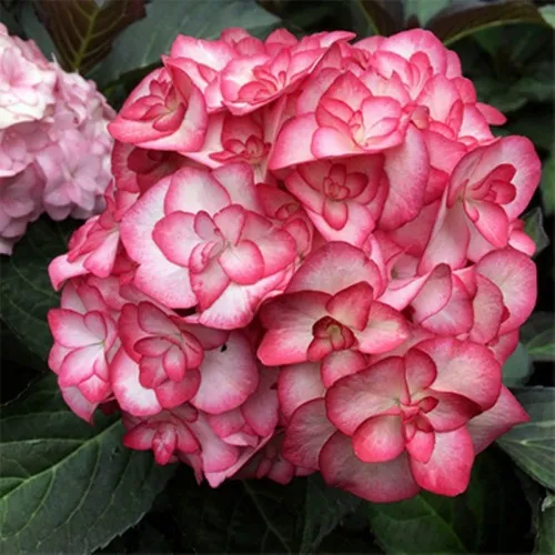 Главная особенность сорта — завораживающее цветение. С середины лета до середины осени кусты покрываются крупными, густыми соцветиями диаметром 15–20 см, состоящими преимущественно из махровых цветков. Уникальная окраска делает Мисс Саори настоящей жемчужиной сада: кремово-белый центр плавно переходит в яркую малиново-розовую кайму лепестков. При похолодании или к концу сезона оттенки становятся более насыщенными, создавая эффект живой картины. Отдельный цветок размером 3–5 см формирует плотную шапку, которая сохраняет декоративность до заморозков. Адаптивность к почве у этого сорта высокая: насыщенные розовые тона каймы сохраняются на кислых и нейтральных субстратах, что облегчает уход и выбор места.