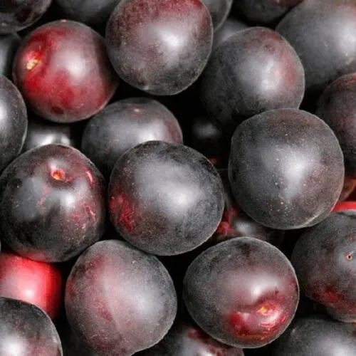 - Округлой формы, тёмно-бордового цвета, покрыты лёгким опушением. Кожица не толстая. Мякоть сочная, по структуре – рыхловатая, винно-красного цвета. Косточка небольшая, умеренно сросшаяся;