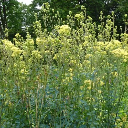 Многолетник достигает 180 см в высоту и формирует вертикальный, слегка раскидистый куст с изящной, сизо-зелёной листвой, похожей на папоротник. Весной побеги поднимаются быстро, летом – раскрываются плотные соцветия лимонно-жёлтого оттенка. Они собраны в рыхлые, пушистые метёлки до 30 см, которые выглядят легко и естественно. Цветение начинается в июле и продолжается до середины августа. Лёгкий аромат привлекает насекомых, делая василистник не только декоративным, но и экологически полезным элементом сада.
