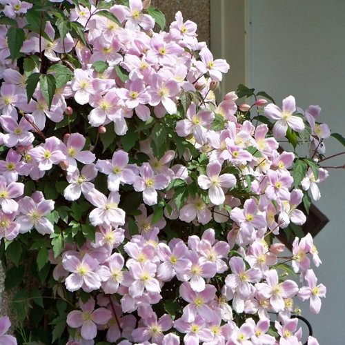 Особая ценность клематиса горного — его весеннее цветение. На прошлогодних побегах распускаются сотни или даже тысячи звёздчатых цветков диаметром 4–7 см. Лепестки тонкие, почти прозрачные, создают эффект лёгкости и воздушности. В России пик цветения приходится на конец мая — начало июня, и длится до четырёх недель. Цветы покрывают всю лиану словно облако: бледно-розовые оттенки образуют мягкую, гармоничную гамму. Некоторые сорта выделяются лёгким сладким ароматом, который приятно ощущается вблизи, особенно в солнечные утренние часы. Цветение настолько обильно, что лиана полностью скрывает опору, превращая её в декоративный элемент садовой композиции. После основного периода отдельные цветки могут появляться ещё некоторое время, создавая эффект лёгкой повторной волны цветения.